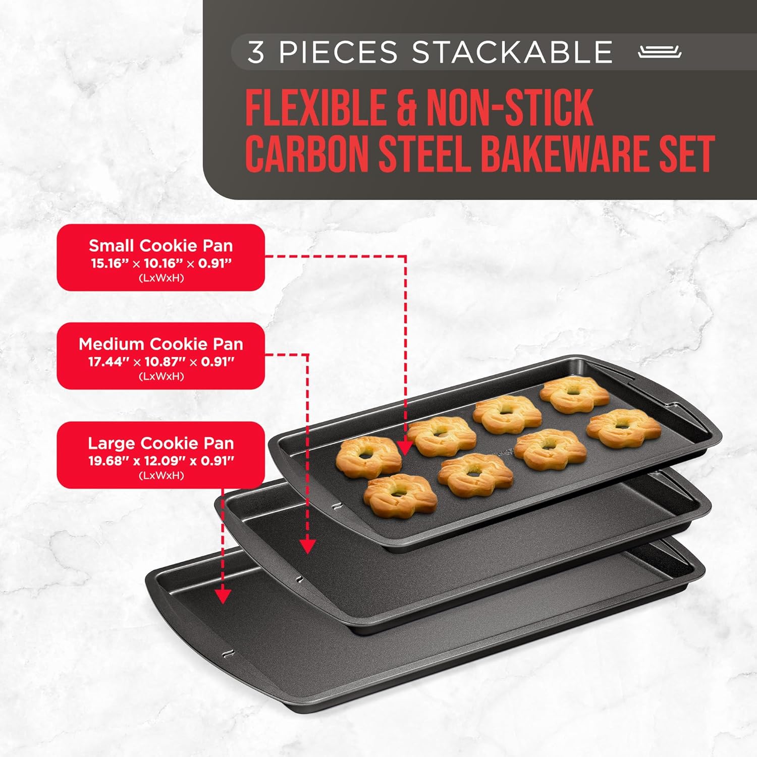 Elevate your home baking game with Bakken's 3-Piece Cookie Sheet Set. Our stackable, non-stick baking pans are designed to make baking a breeze and ensure your creations look and taste perfect every time. There are 3 sizes included in your set including the small cookie sheet measuring 15.16 × 10.16  × 0.91 inches, the medium cookie sheet measuring 17.44 × 10.87 × 0.91 inches and the large cookie sheet measuring 19.68 x 12.09 x 0.91 inches. Featuring a deluxe nonstick ceramic Gray  coating our premium coating guarantees your cookies and baked goods release effortlessly after every bake. You'll feel like a pro baker in your own kitchen. Crafted from flexible and nonstick carbon steel, our bakeware sheets are ideal for home kitchens. Its professional-grade quality ensures even baking results with a temperature tesistance of up to 450° Fahrenheit (230° Celsius), they really are built to withstand the demands of home baking, regardless of your abilities. The stackable wide tray pan design not only saves you valuable cabinet space but also keeps your kitchen organized. From cookies to cakes and sheet pan dinners, these pans are versatile enough for everyday use. The Bakken 3-Piece Cookie Sheet Set offers a unique combination of functionality, durability, and style. BUY NOW and bring out your inner baker and take your home baking to new heights.