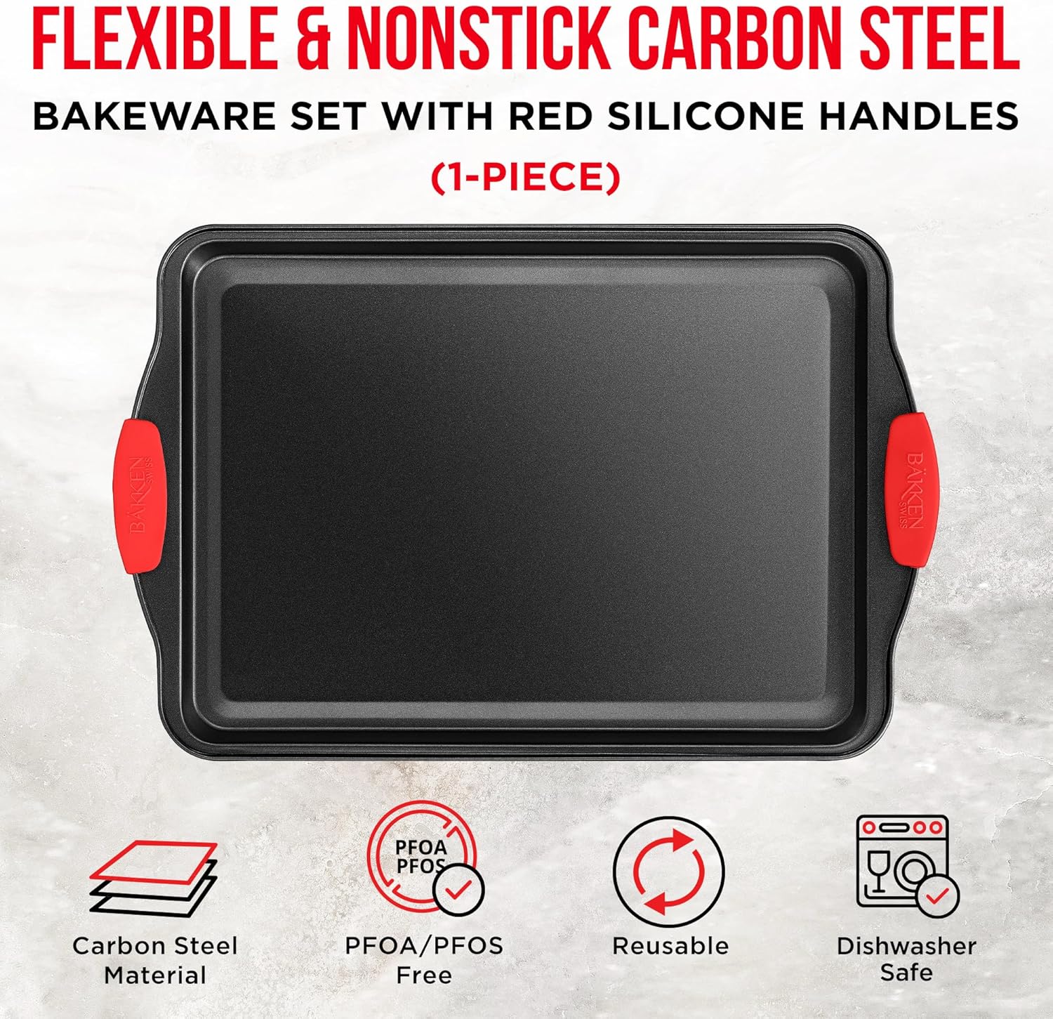 BAKKEN Cookie Sheets for Baking Nonstick Set - 3-Piece Stackable Carbon Steel Baking Sheet Pans Set with Silicone Handles, Non Toxic Cookie Sheets for Baking Bakeware Set - Black