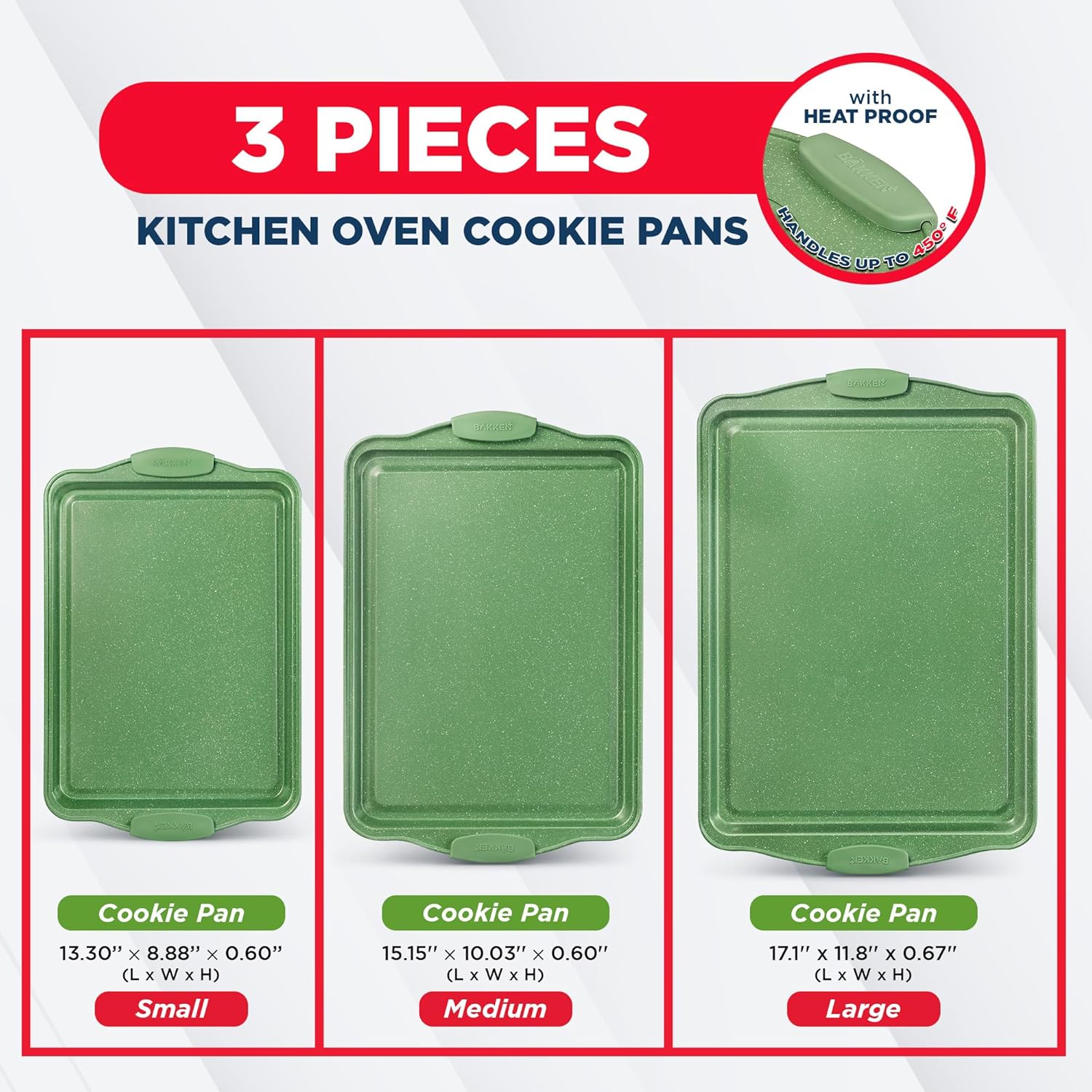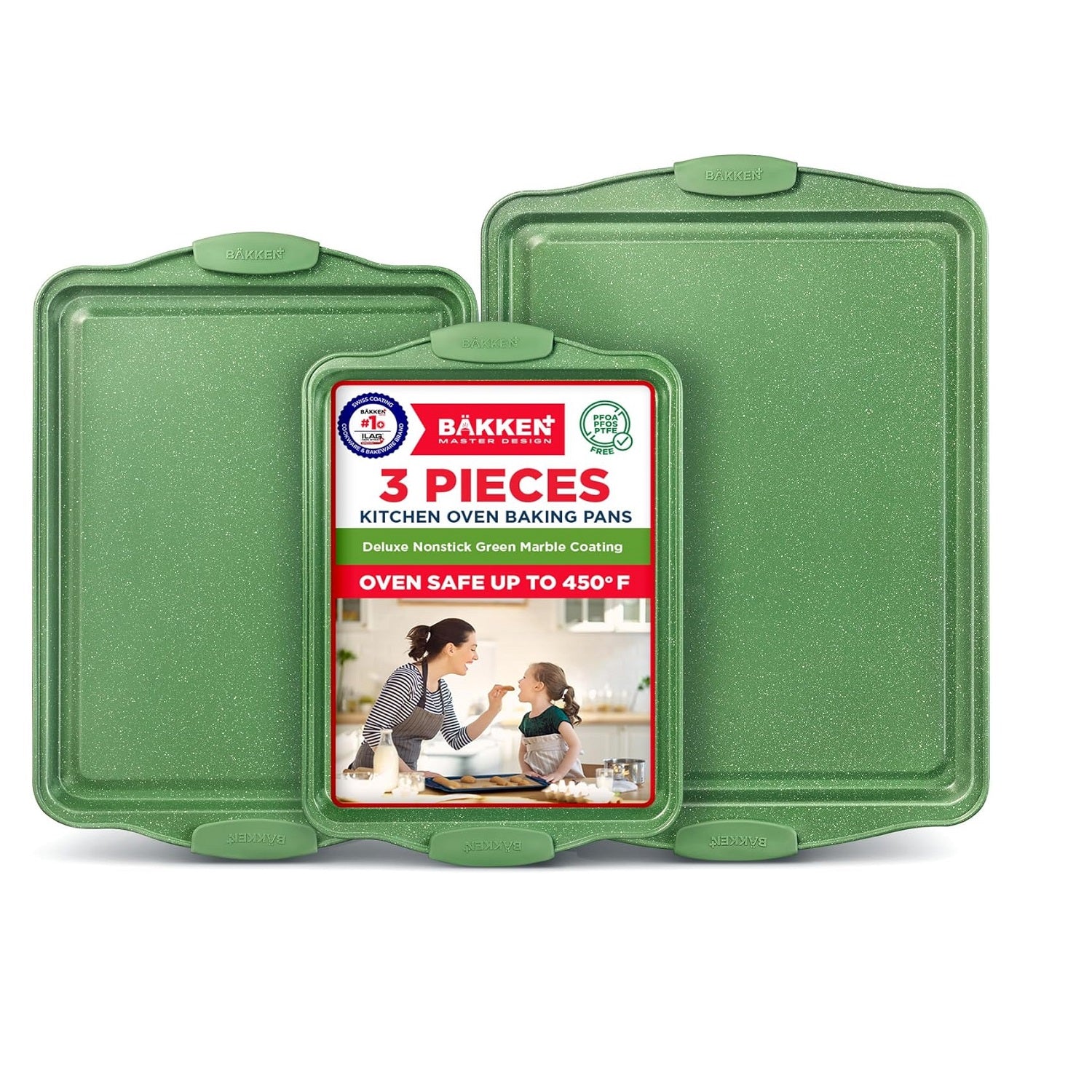 BAKKEN Kitchen Baking Pan Set - Nonstick Green Marble Coating, Carbon Steel Bakeware Sets with Green Silicone Handles, Kitchen Essentials, PFOA, PFOS, PTFE Free, Oven Safe (Up To 450° F), Set of 3