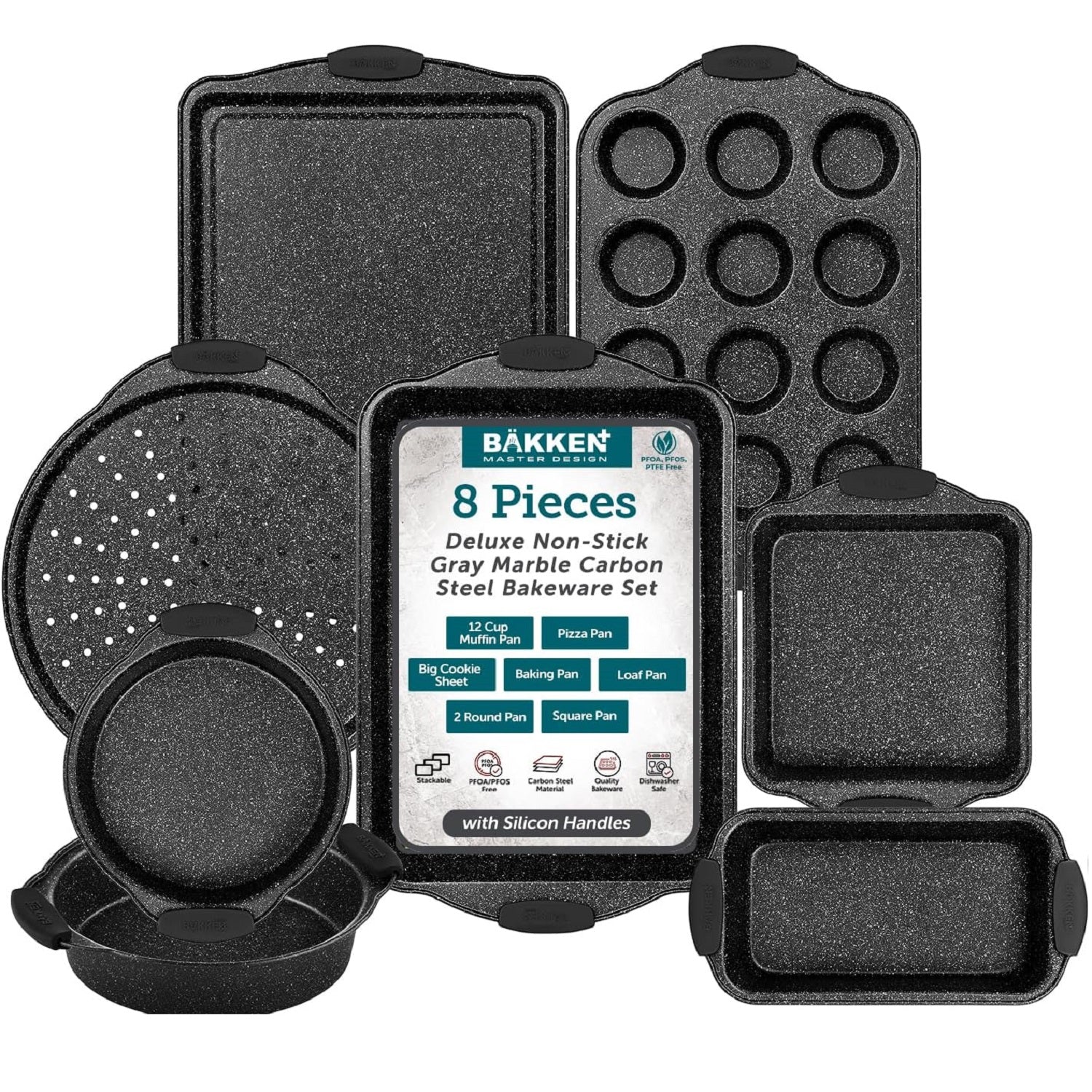 BAKKEN 8-Piece Kitchen Oven Baking Pans Set - Deluxe Nonstick Gray Marble Coating, Professional Grade Carbon Steel Bakeware with Silicone Handles - Oven, Dishwasher, and Freezer Safe