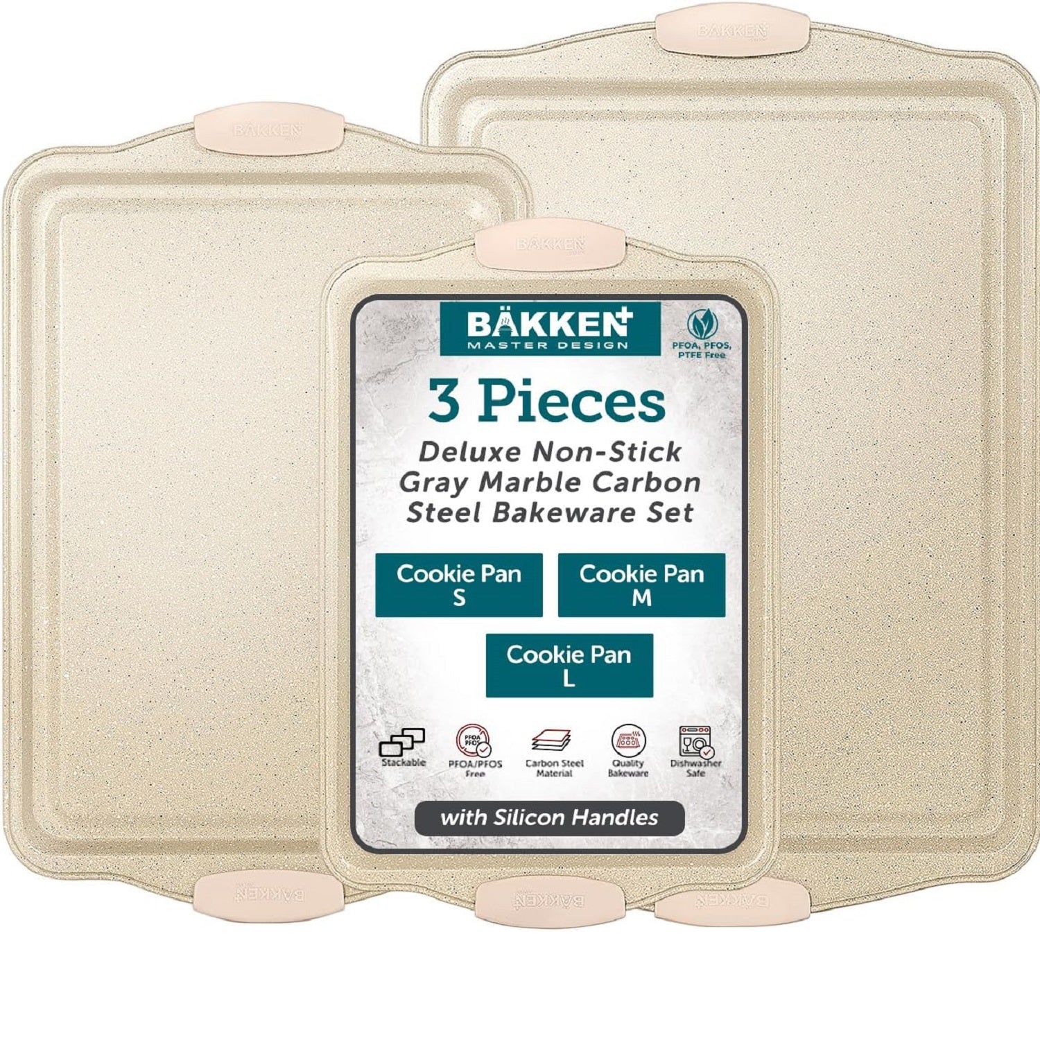 BAKKEN Cookie Sheets for Baking Nonstick Set - 3-Piece Stackable Carbon Steel Baking Sheet Pans Set with Silicone Handles, Non Toxic Cookie Sheets for Baking Bakeware Set - White Marble