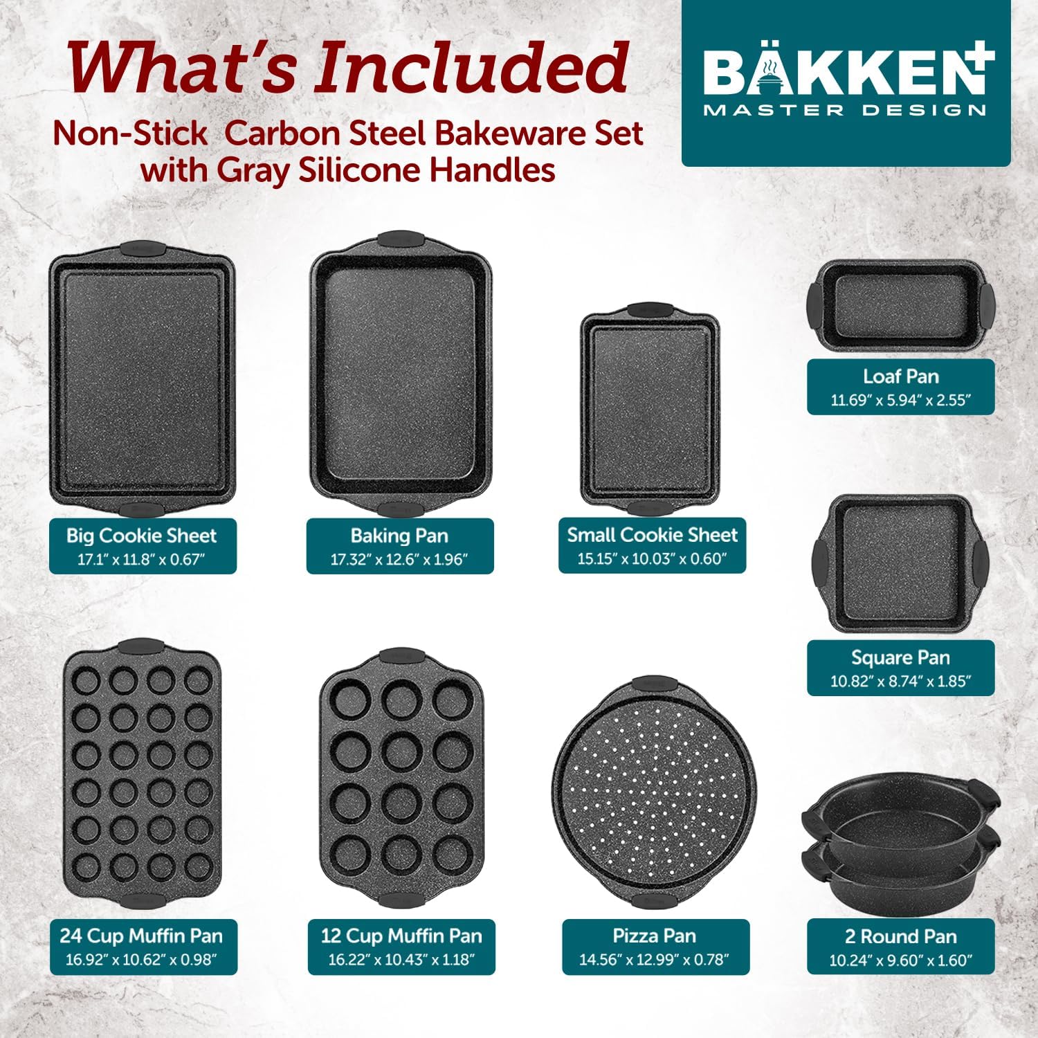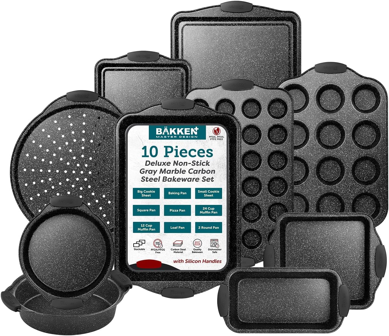 Introducing the BAKKEN Kitchen Oven Baking Pans - a deluxe set of nonstick bakeware designed to elevate your baking experience. Crafted from high-quality carbon steel with a premium white marble coating inside and out, these pans ensure effortless release of your baked goods and easy cleanup. The silicone handles provide a comfortable grip, while the stackable design saves valuable storage space. Whether you're a professional baker or a home cook, this versatile set is perfect for baking cookies, cakes, muffins, and more. With temperature resistance up to 446°F, dishwasher-safe convenience, and a durable construction, the BAKKEN baking pans are your go-to choice for creating delicious treats every time.