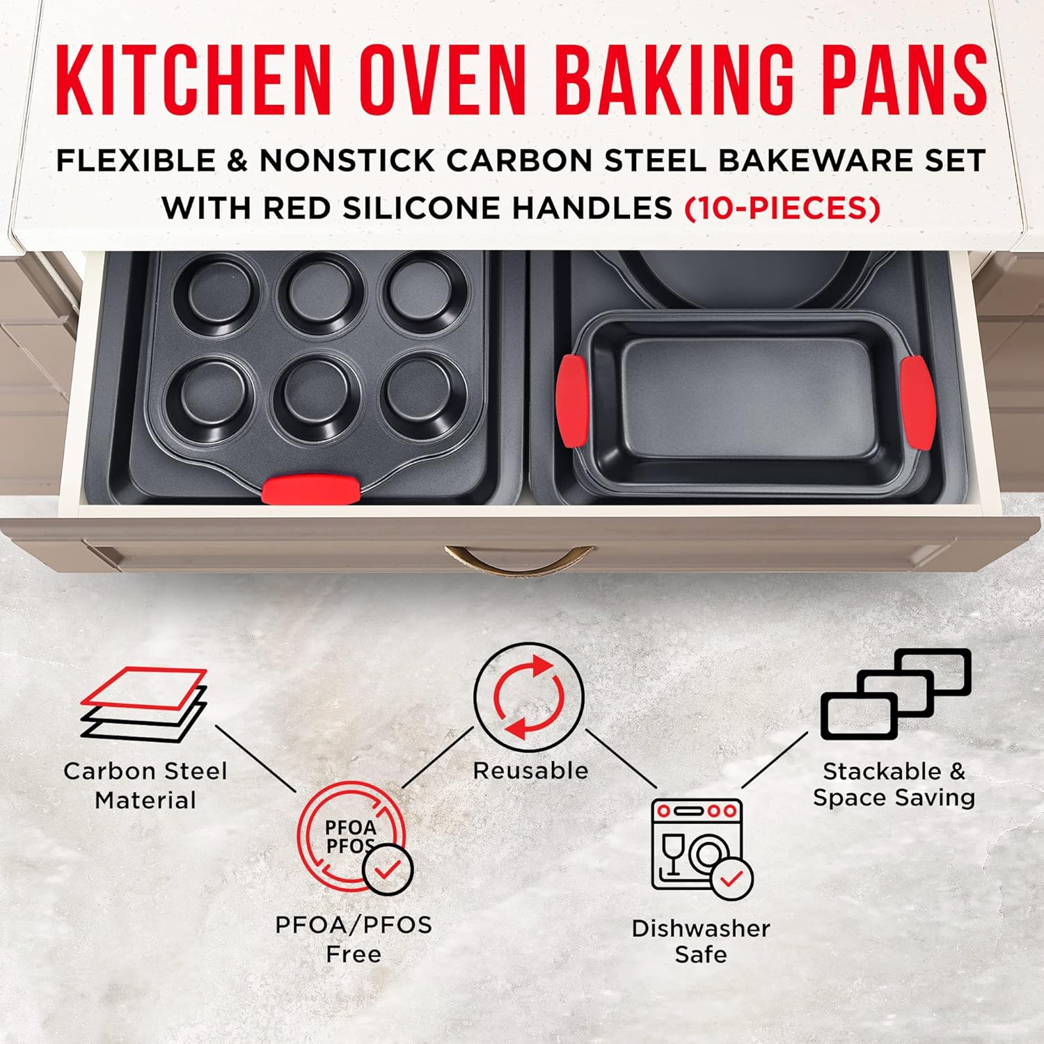 BAKKEN Kitchen Baking Pan Set - Nonstick Coating, Carbon Steel Bakeware Sets with Red Silicone Handles, Baking Kitchen Essentials, PFOA, PFOS, PTFE Free, Oven Safe Tray (Up To 450° F), Set of 18