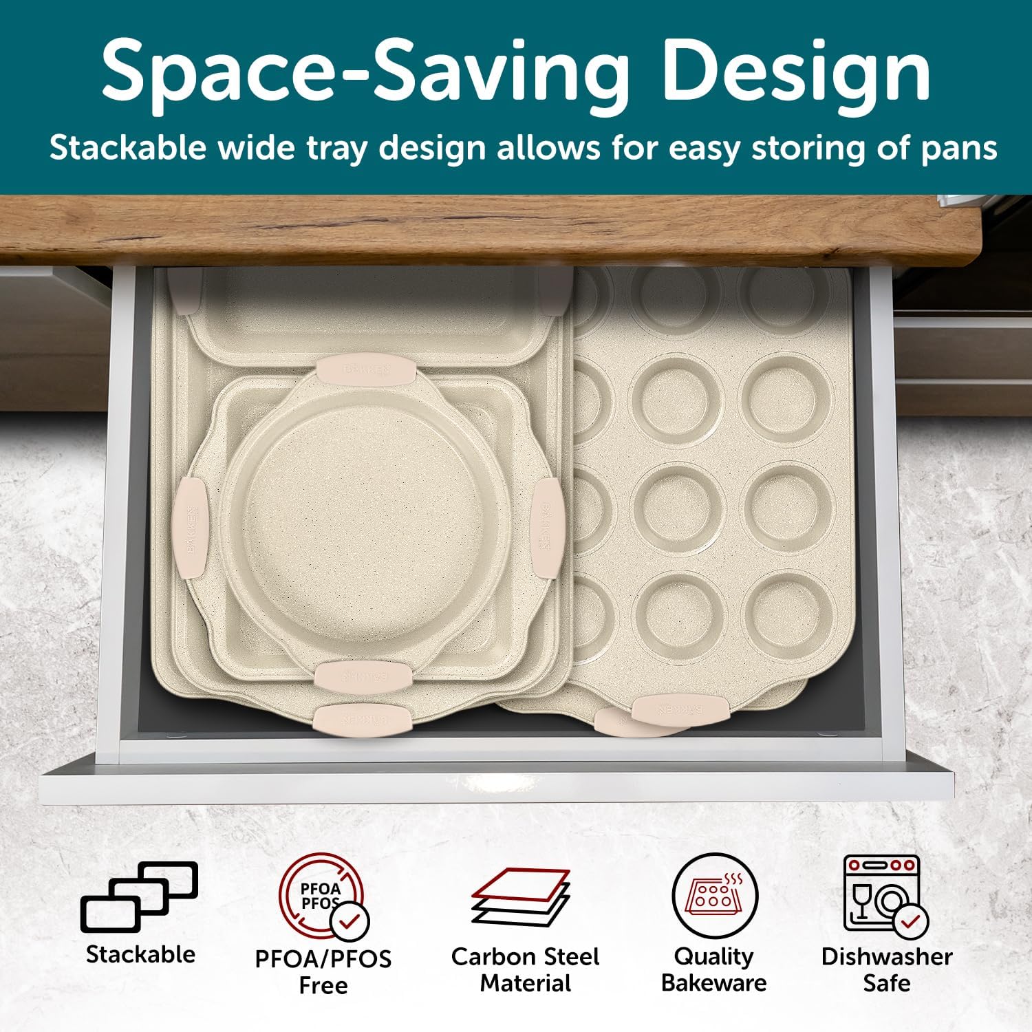 Deluxe 8-Piece Carbon Steel Bakeware Set - Nonstick White Marble Coating, Silicone Handles - Professional Quality Kitchen Oven Baking Pans