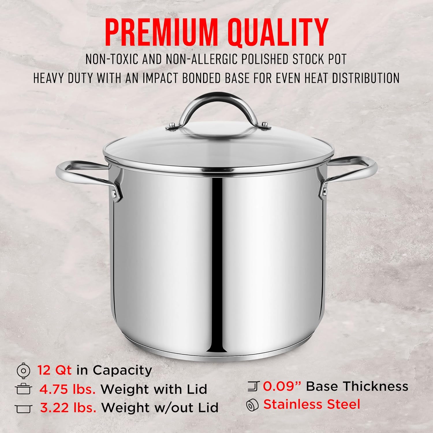 Bakken-Swiss Deluxe 12-Quart Stainless Steel Stockpot w/Tempered Glass See-Through Lid - Simmering Delicious Soups Stews & Induction Cooking - Exceptional Heat Distribution - Heavy-Duty & Food-Grade