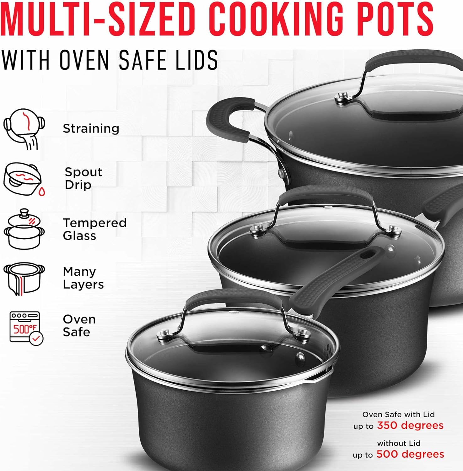 Cookware Set – 23 Piece –Black Multi-Sized Cooking Pots with Lids, Skillet Fry Pans and Bakeware – Reinforced Pressed Aluminum Metal - for Gas, Electric, Ceramic and Induction by BAKKEN Swiss