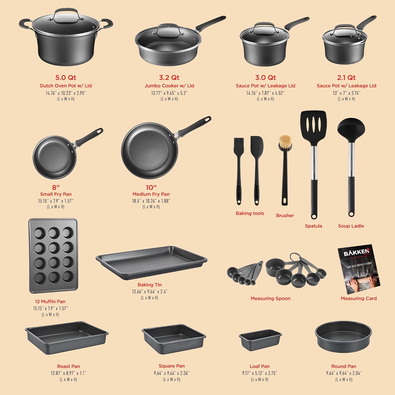 Premium quality cookware Suitable for induction, gas, electric and ceramic countertop cookers, our collection of pots, pans, utensils and bakeware is a great kit for those starting out in their first home. Everything needed for cooking meals and home baking is included. Why shop for everything individually when you can buy everything in one convenient set, plus it matches too!   What is included: Sauce Pot with Leakage Lid - 2.1QT, Sauce Pot with Lid - 3.0 QT, Dutch Oven Pot with Lid - 5 QT, Jumbo Cooker with Lid - 3.2QT Small Fry Pan - 8-Inch, Medium Fry Pan - 10-Inch, Soup Ladle, Spatula, Brusher, Baking tools, Measuring Spoon, Muffin Pan, Loaf Pan, Round Pan, Square Pan, Roast Pan and Baking Tin.   Technical specification: Max Temperature: 500° Fahrenheit (260° Celsius). Construction Material: Reinforced Pressed Aluminum Metal, Engineered Silicone, Tempered Glass. Coating Thickness: 20-25 um, 2.8-3.0mm Multi-Layered Cookware. Material Metal Hardness: 1-2 HB. Sauce Pot Size (L x W x H): 13’’ x 7’’ x 3.74’’ - inches (with Lid) Sauce Pot Size (L x W x H): 14.76’’ x 7.87’’ x 4.52’’ - inches (with Lid) Dutch Oven Pot Size (L x W x H): 13.77’’ x 9.45’’ x 5.2’’ - inches (with Lid) Jumbo Cooker Size (L x W x H): 14.76’’ x 10.23’’ x 2.95’’ - inches (with Handle) Small Fry Pan Size (L x W x H): 15.15’’ x 7.9’’ x 1.57’’ - inches (with Handle) Medium Fry Pan Size (L x W x H): 18.5’’ x 10.24’’ x 1.88’’ - inches (with Handle) Muffin Pan Size (L x W x H): 16.65’’ x 11.73’’ x 1.61’’ - inches Loaf Pan Size (L x W x H): 9.17’’ x 5.12’’ x 2.75’’ - inches Round Pan Size (L x W x H): 9.64’’ x 9.64’’ x 2.04’’ - inches Square Pan Size (L x W x H): 9.64’’ x 9.64’’ x 2.36’’ - inches Roast Pan Size (L x W x H): 13.66’’ x 9.64’’ x 2.4’’ - inches Baking Tin Size (L x W x H): 12.87’’ x 8.97’’ x 1.1’’ - inches                             BUY NOW and upgrade your tired and overused cookware to our 23 piece set for convenient, easy to use cooking in your home