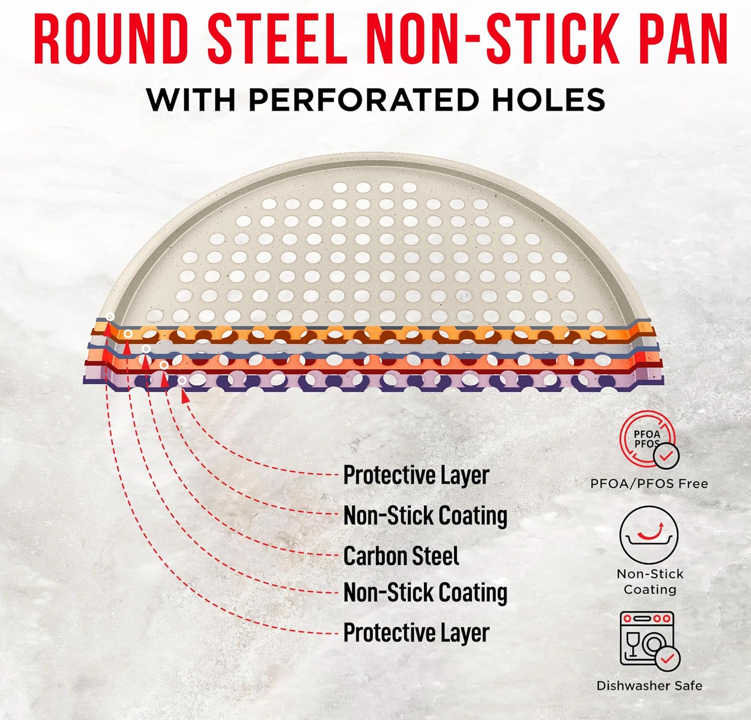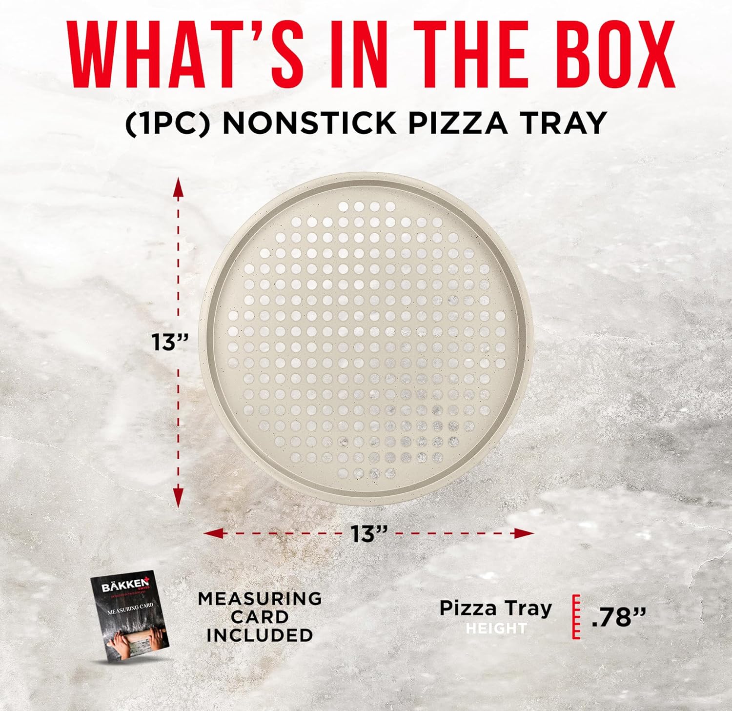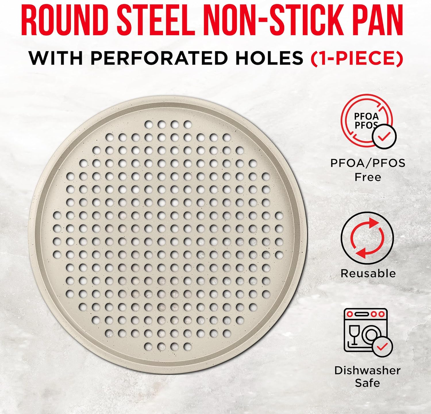 Bakken Pizza Baking Pan - Round Perforated Carbon Steel Pan with Non-Stick Marble Coating, Oversized Silicone Handle, Dishwasher Safe, High-Temperature Resistant, Durable & Easy Cleanup White, 1 Pack