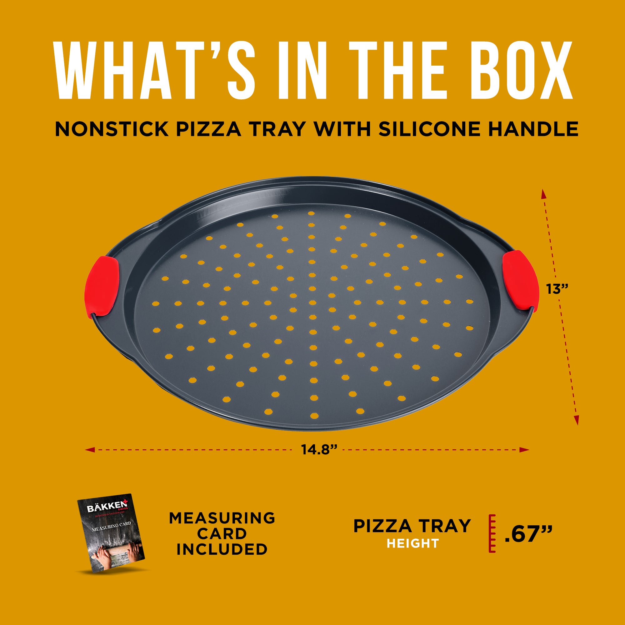 Product Description: What’s included Non-Stick Pizza Tray with Silicone Handles   Technical information  Temperature Resistance: up to 450° Fahrenheit (230° Celsius) Metal Tray Thickness: 0.4mm Internal and External Coating: non-stick coating grey color Construction Material: carbon steel with non-stick coating Product Dimensions (L x W x H): 14.8 x 13 x 1 inches              Switch to home-cooked pizza Save money by cooking your pizza at home. Expensive takeout’s soon add up and by making your pizzas at home you can achieve just as good a flavor when using the right equipment. Our perforated tray for pizzas is the perfect choice for baking store-bought chilled or frozen pizzas or for ones you make completely from scratch. Making your own dough and choosing your own toppings is great fun and it’s something the entire family can get involved with.   BUY NOW and enjoy perfectly cooked pizza with a crispy base when baking on our non-stick pizza tray with holes and handles