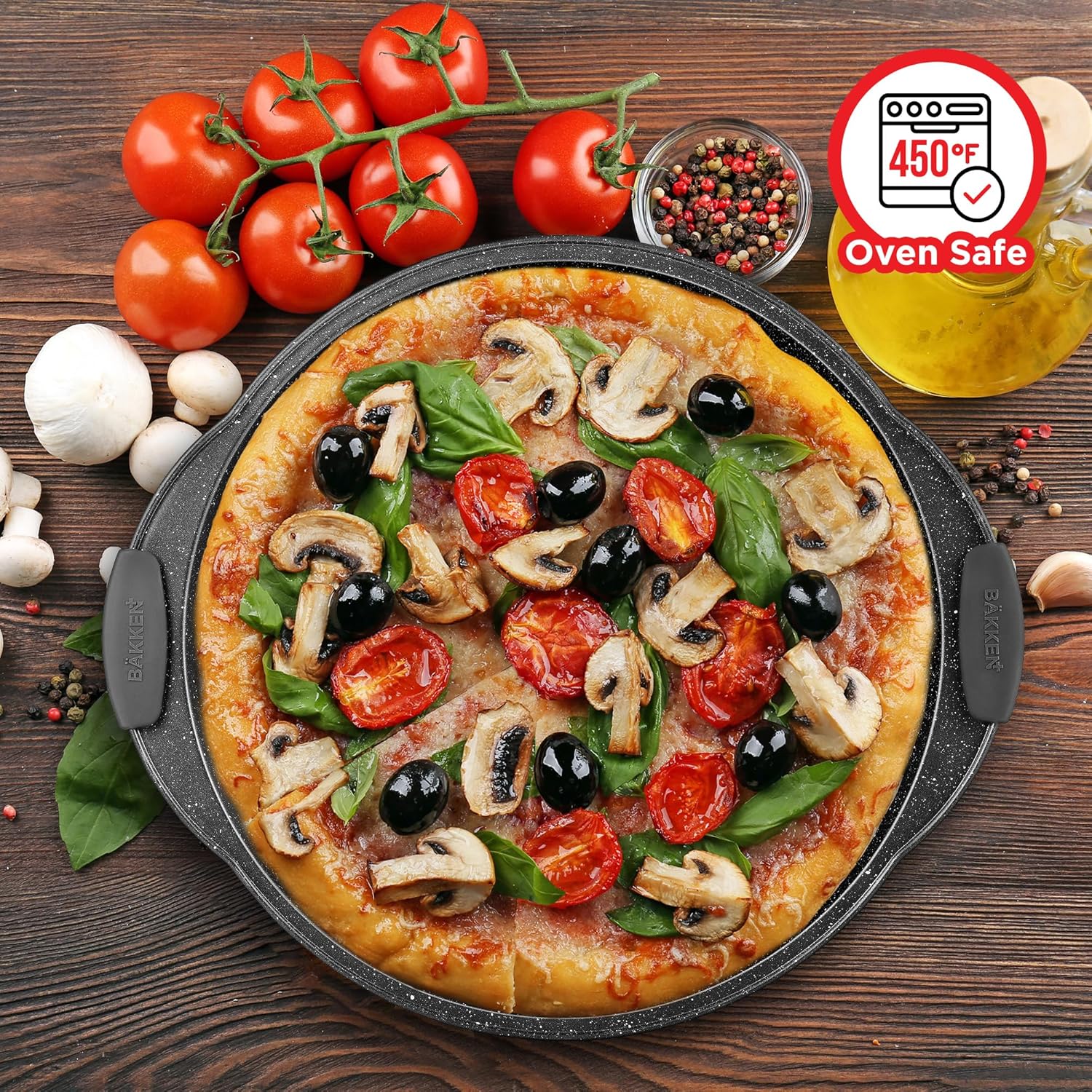 Made from high-quality carbon steel, this Bakken round pizza pan is built for exceptional durability and long-lasting performance, making it a reliable addition to your bakeware collection for years to come. Featuring a robust gray marble non-stick coating on both the interior and exterior, this pan guarantees effortless food release and easy cleanup. The advanced non-stick technology prevents food from sticking, reducing the need for excessive oils and making baking and serving your favorite dishes hassle-free. The round steel pan includes strategically placed perforated holes that promote even heat distribution, resulting in perfectly crispy pizza crusts every time. The silicone, oversized handle ensures a secure and comfortable grip, making it easy to safely handle the pan in and out of the oven. Designed to withstand high temperatures up to 450° Fahrenheit (230° Celsius), this versatile pizza baking pan is perfect for a wide range of baking applications. Whether you're crafting delicious homemade pizzas, cookies, or other treats, this pan delivers consistent results every time. Committed to your health and safety, this bakeware is free from harmful chemicals such as PFOA, PFOS, and PTFE. It is also dishwasher safe, providing you with the convenience of quick and hassle-free cleaning, so you can spend more time enjoying your delicious creations.