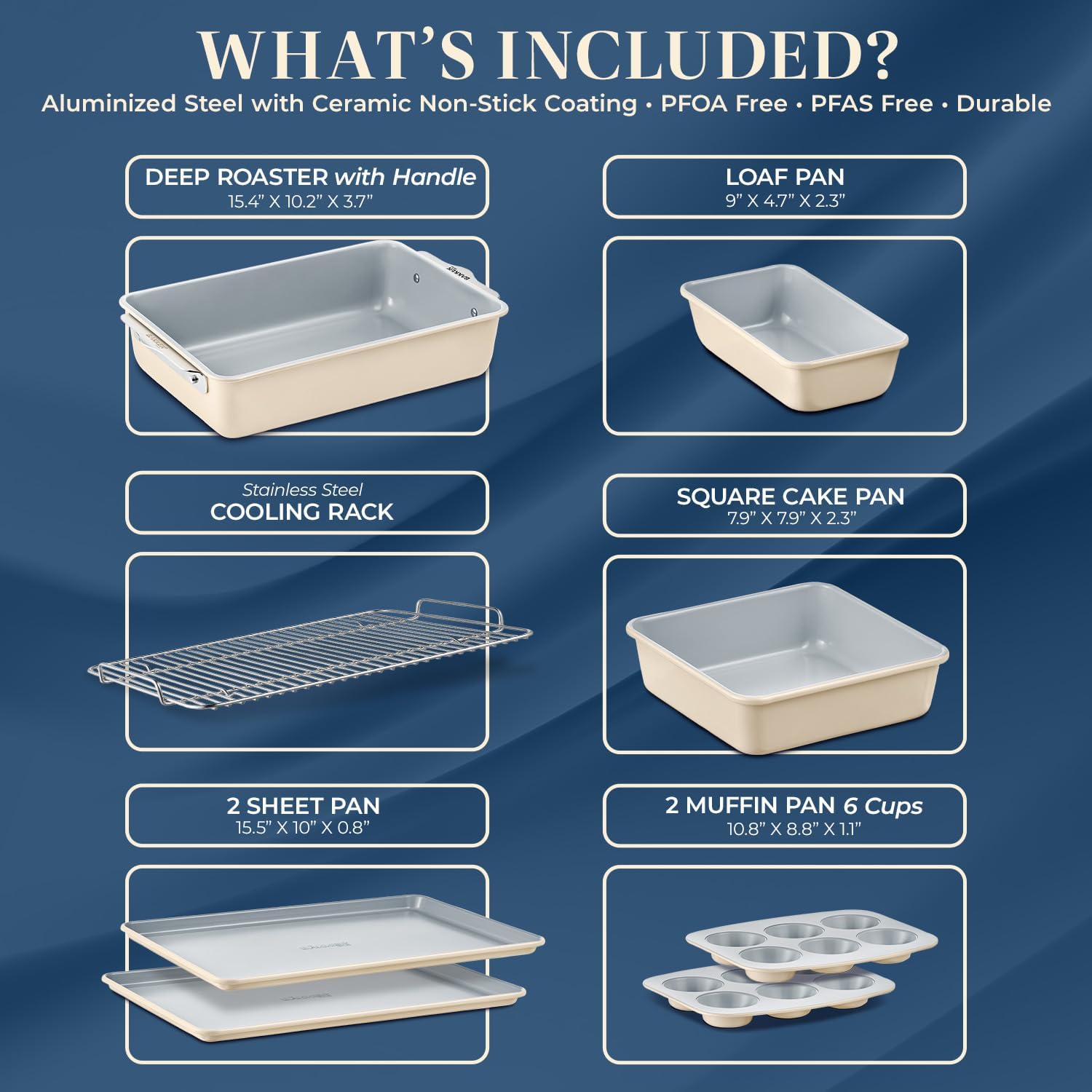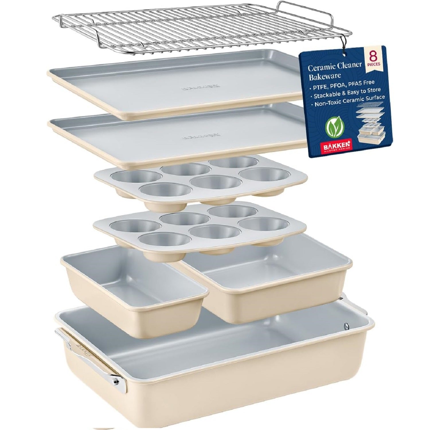 Bakken 8-Piece Stackable Bakeware Set - Ceramic Non-Stick Coating, Baking Sheets, Assorted Baking Pans, PTFE, PFOA & PFOS Free - Healthy Baking, Ergonomic Handles, Cooling Rack, Non-Toxic, Oven-Safe