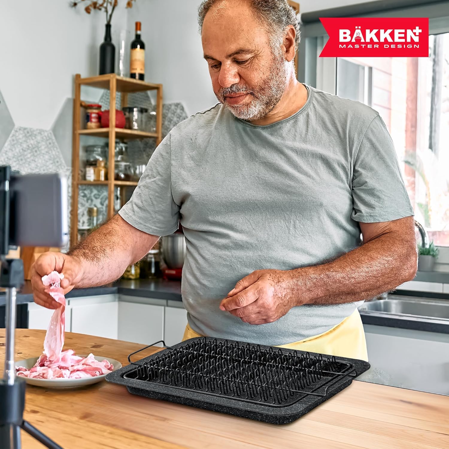 The Bakken bacon tray is the key to perfect bacon without the mess and hassle of traditional frying. This 2-piece set is designed to make bacon cooking a breeze, creating healthier, delicious results every time without unhealthy dripping grease spoiling your culinary creations. Our bacon tray is not just a kitchen tool; it's a game-changer for bacon lovers. Enjoy perfectly cooked bacon thanks to the premium non-stick black stone coating and carbon steel, which ensures your bacon won't stick, and cleanup is simple and quick. Unlike frying, our tray allows excess grease to drip off the bacon and onto the rack below, reducing fat content and making your meals healthier. It's time to savor the rich, smoky flavor of bacon without the guilt. Do away with frying bacon for good. Cooking bacon has never been this versatile. The included removable rack lets you cook multiple strips of bacon at once. Whether you prefer your bacon crispy or tender, our tray caters to your every preference and is a game changer when you’re cooking for a larger group. Made from durable carbon steel, our bacon tray is built to withstand the demands of your kitchen, ensuring long-lasting performance. Plus, it's dishwasher safe, making cleanup hassle-free. Suitable for most ovens, the marble stone baking tray measures 12.99 x 9.06 x 1.5 inches and the carbon bacon rack measures 13.58 x 7.36 x 1.18 inches. BUY NOW and say goodbye to frying and hello to guilt-free delicious bacon