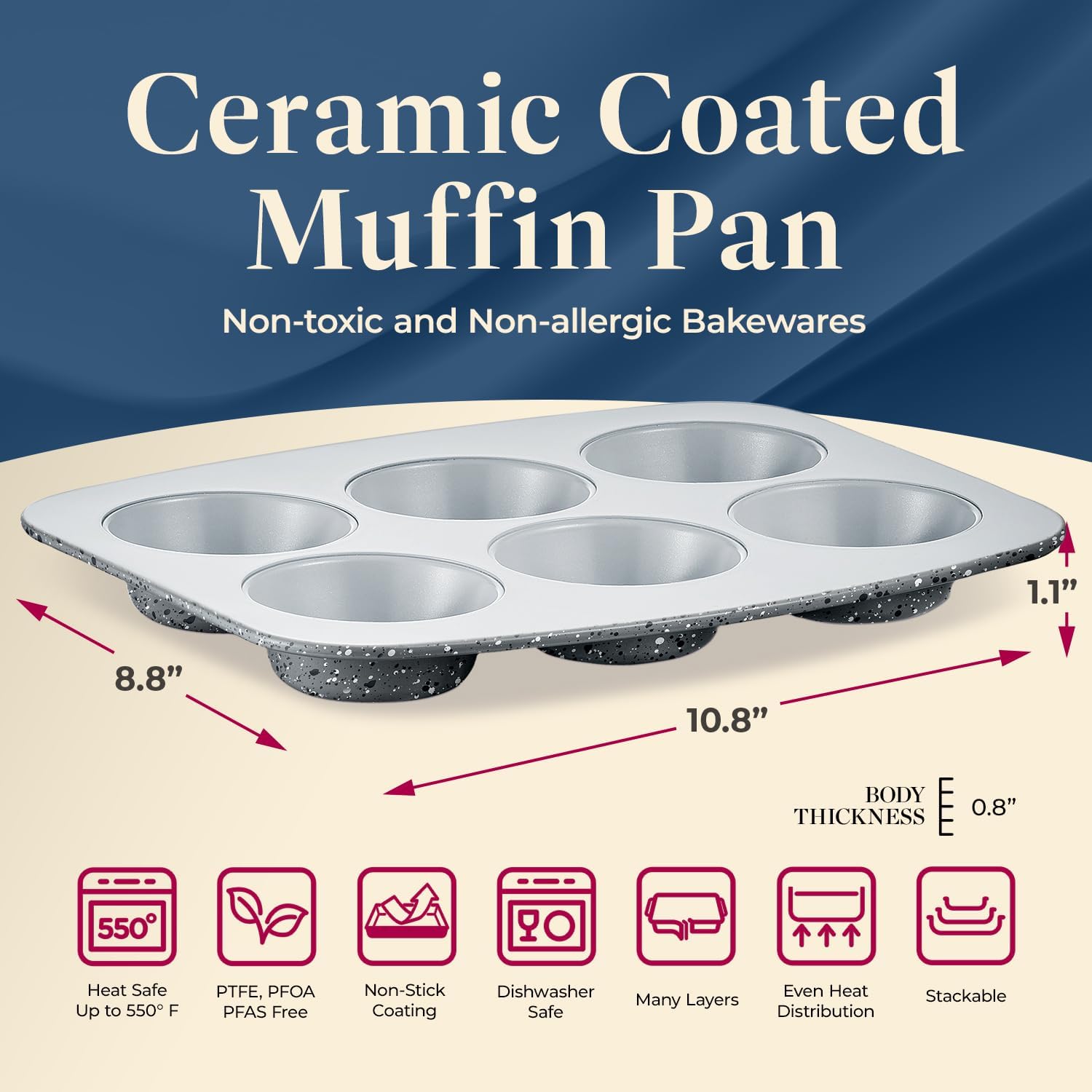 Elevate your baking experience with our 6-Cup Cake/Muffin Pan Set, featuring a stunning array of colors – Blue, Teal, Marble, Golden, Cream. Crafted from high-gauge aluminized steel, this bakeware ensures durability and even heat distribution for consistently delicious results. The premium ceramic non-stick coating, free from PFOA, PFAS, and PTFE, guarantees a healthy baking experience. Sized at 10.8x8.8 inches, it's versatile for cakes, muffins, and more, fitting standard ovens perfectly. With a stylish exterior and superior functionality, this pan set blends elegance with practicality, making it a must-have for your kitchen. Explore a new level of baking excellence today!