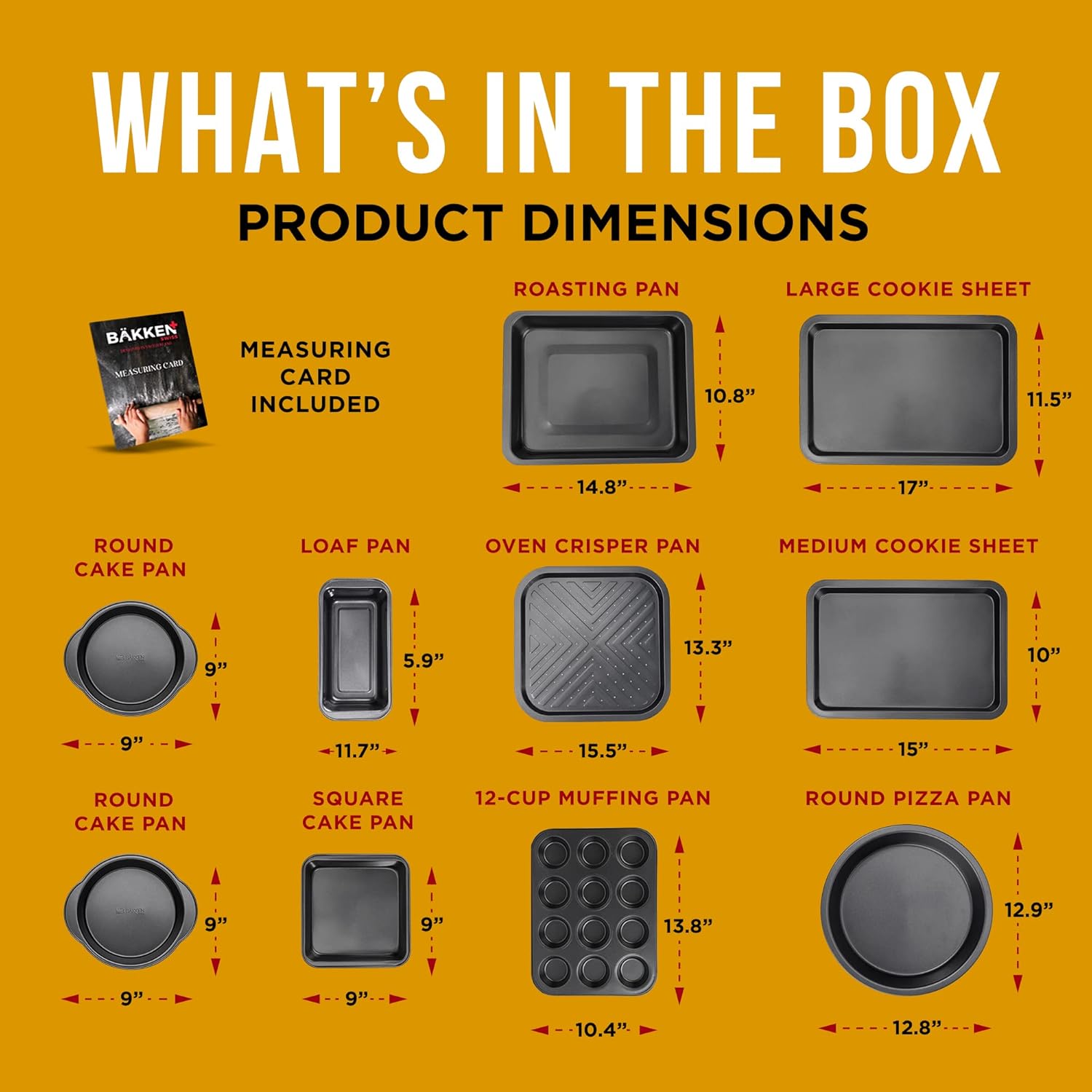 Product Description: What is included 10 Piece Bakeware Set: 1x Roasting Pan, 1x Oven Crisper Pan, 1x Round Pizza Pan, 1x Medium Cookie Sheet, 2x Round Cake Pans, 1x Square Cake Pan, 1x Loaf Pan, 1x Large Cookie Sheet and 1x 12 Cup Muffin Pan. Technical Information Temperature Resistance: up to 446° Fahrenheit (230° Celsius) Construction Material: Carbon Steel Metal Tray Thickness: 0.4mm Roasting Pan Size (L x W x H): 14.75 x 10.75 x 2.75 inches Round Pizza Pan Size (L x W x H): 12.8 x 0.6 inches Large Cookie Sheet Size (L x W x H): 17 x 11.5 x 0.75 inches Medium Cookie Sheet Size (L x W x H): 15 x 10 x 0.75 inches Round Cake Pans Size (L x W x H): 9 x 9 x 1.5 inches Square Cake Pan Size (L x W x H): 9 x 9 x 1.75 inches Loaf Pan Size (L x W x H): 10 x 5.75 x 2.25 inches Oven Crisper Pan Size (L x W x H): 15.5 x 13.25 x 1.25 inches 12-Cup Muffing Pan Size (L x W x H): 13.8 x 10.4 x 1.18 inches A great gift Treat someone who has just moved into their new home or a friend or family member who has recently moved house to our 10 piece bakeware set. It has everything they need for baking at home whether it be sweet treats or meals. The premium quality will ensure the set lasts a long time and will look good in their new kitchen. BUY NOW and use restaurant quality cooking and bakeware in your home for tasty and delicious bakes