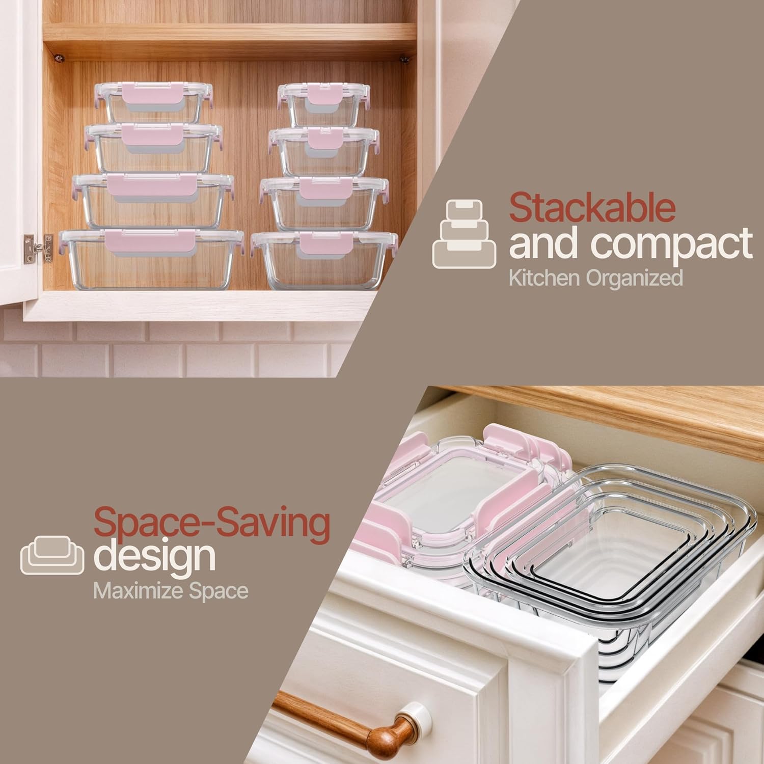 Bakken Borosilicate Glass Food Storage Containers with Lids 24 Pieces, Airtight Leak-Proof, Pink