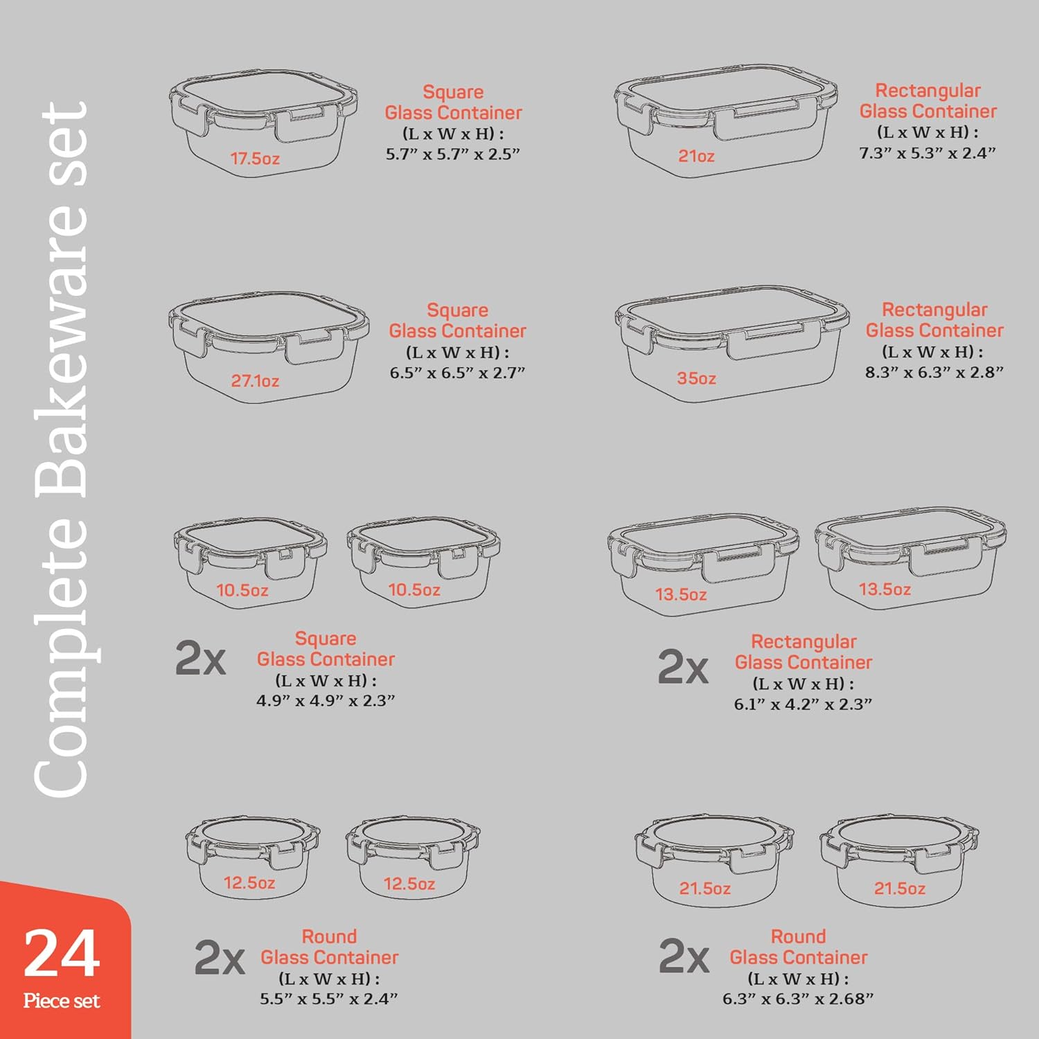 This complete 24-piece set includes 12 glass containers with 12 lids in versatile shapes and sizes to suit all your kitchen needs: