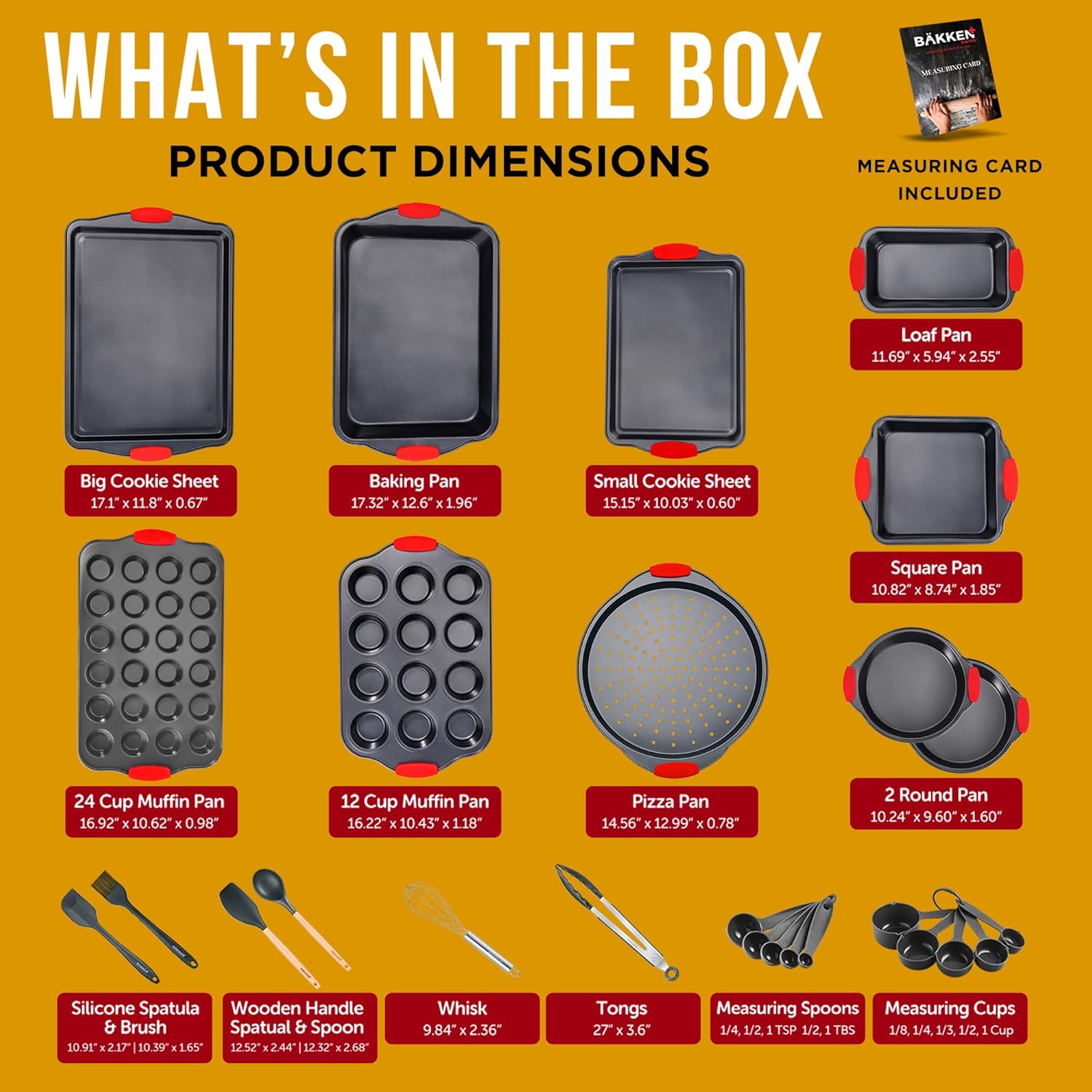 BAKKEN Kitchen Baking Pan Set - Nonstick Coating, Carbon Steel Bakeware Sets with Red Silicone Handles, Baking Kitchen Essentials, PFOA, PFOS, PTFE Free, Oven Safe Tray (Up To 450° F), Set of 18