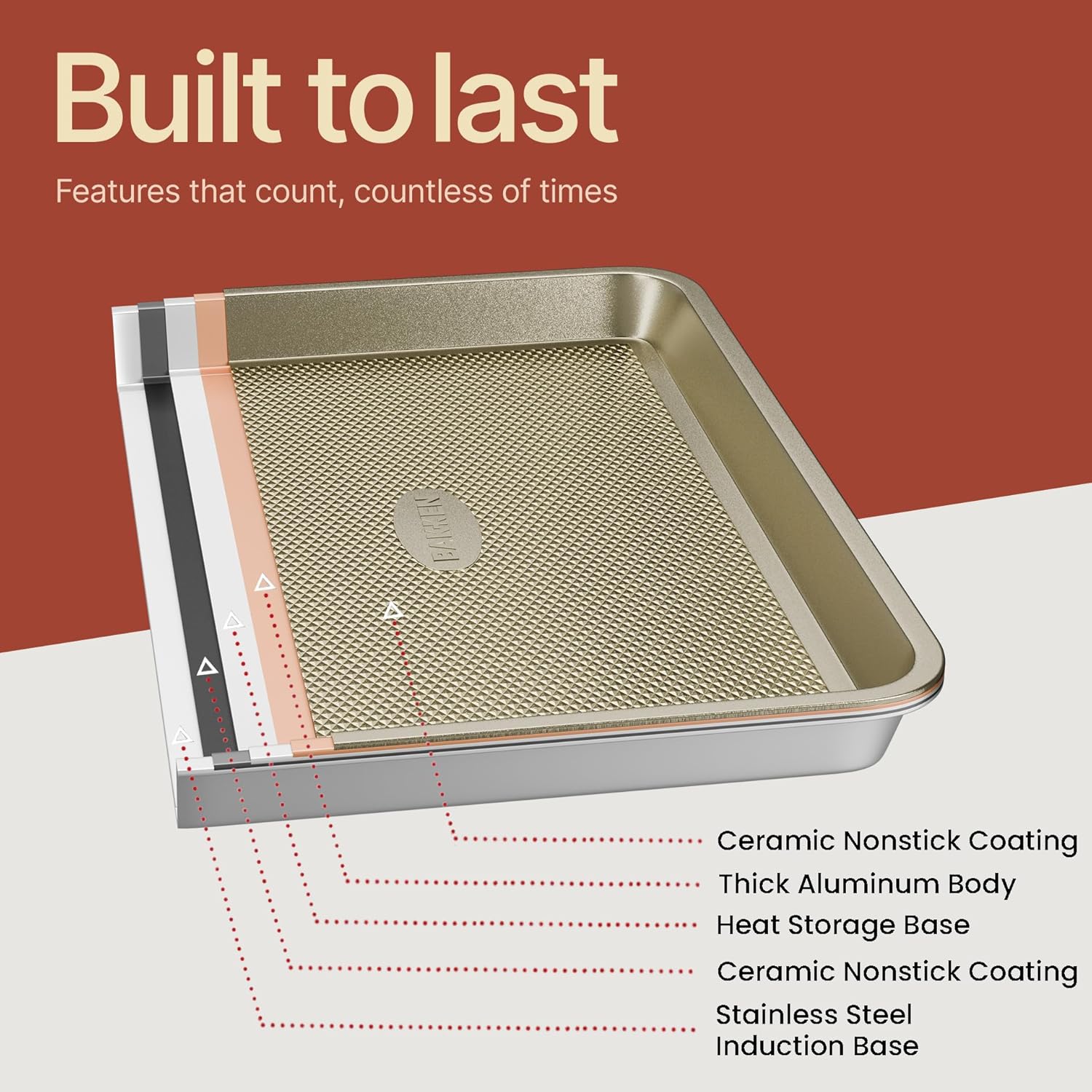 Bring bakery-level results into your home kitchen with the BAKKEN Diamond Bottom Cookie Sheet Set. Designed with a raised diamond-textured base, this cookie sheet pan promote hot air circulation for crisp, evenly baked results—whether you’re making a fresh batch of cookies, roasting vegetables, or preparing a sheet-pan dinner. Each tray is finished with a deluxe champagne-gold nonstick coating inside and out, ensuring effortless food release and quick cleanup without the need for oils or sprays. Best of all, the coating is completely free from PFOA, PFOS, and PTFE, so you can bake with confidence knowing your food is safe.