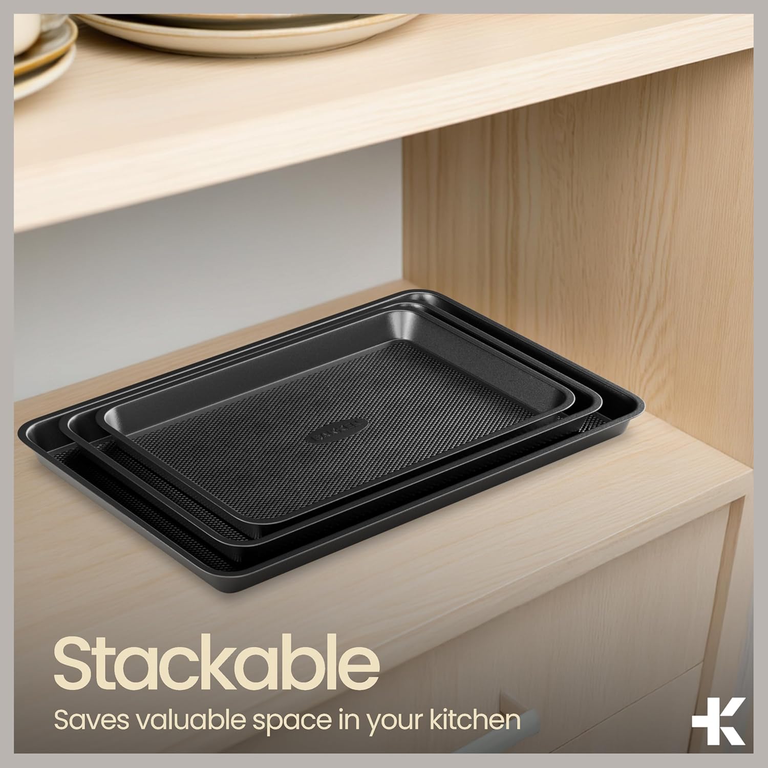 Bring bakery-level results into your home kitchen with the BAKKEN Diamond Bottom Cookie Sheet Set. Designed with a raised diamond-textured base, this cookie sheet pan promote hot air circulation for crisp, evenly baked results—whether you’re making a fresh batch of cookies, roasting vegetables, or preparing a sheet-pan dinner. Each tray is finished with a deluxe champagne-gold nonstick coating inside and out, ensuring effortless food release and quick cleanup without the need for oils or sprays. Best of all, the coating is completely free from PFOA, PFOS, and PTFE, so you can bake with confidence knowing your food is safe.