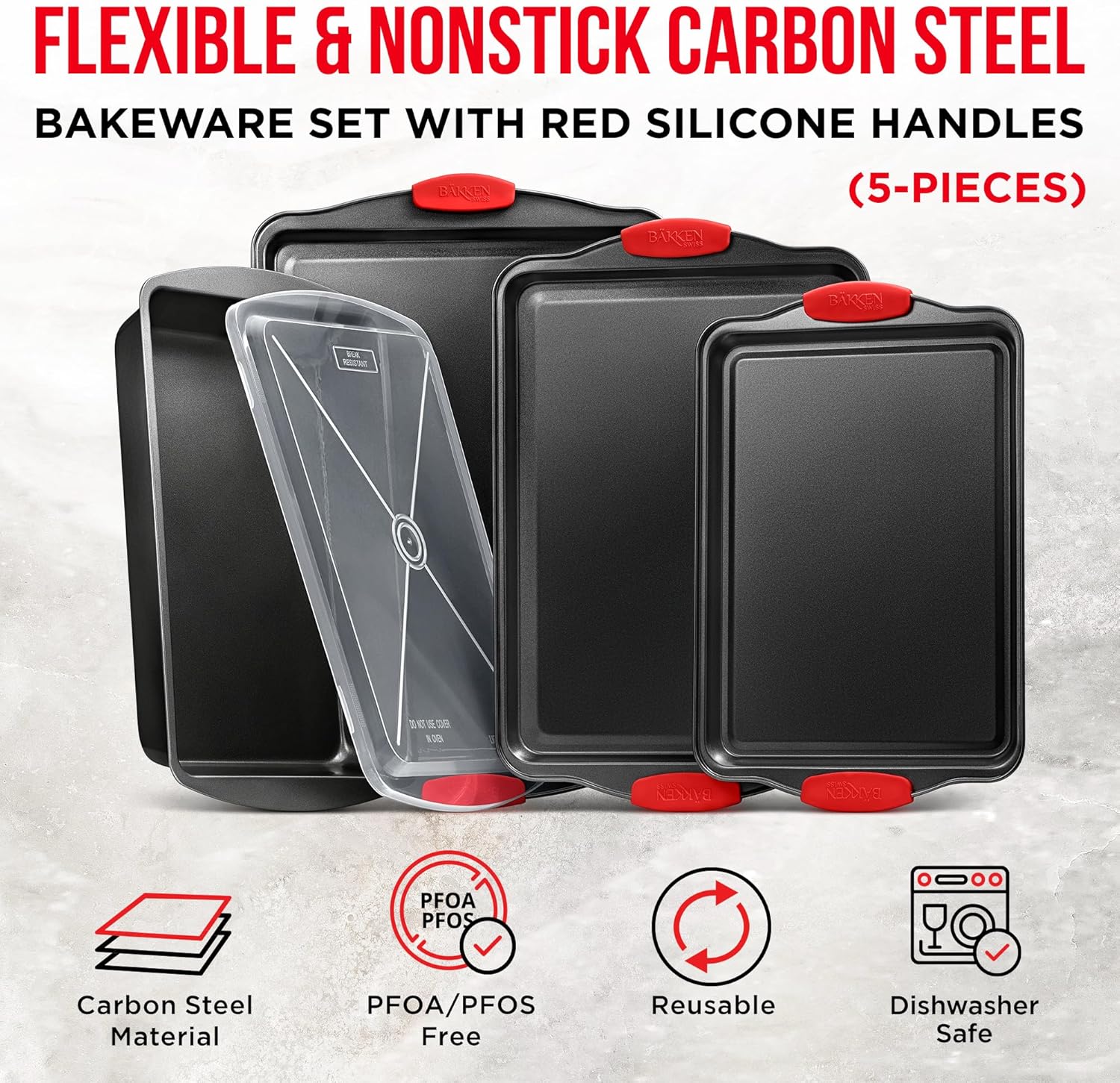 Nonstick Cookie Sheet Pans Set of 5 - Professional Quality Carbon Steel Baking Sheet Trays with Gray Coating Inside & Outside – Small, Medium, Large Pans, Roaster Pan, and Plastic Lid