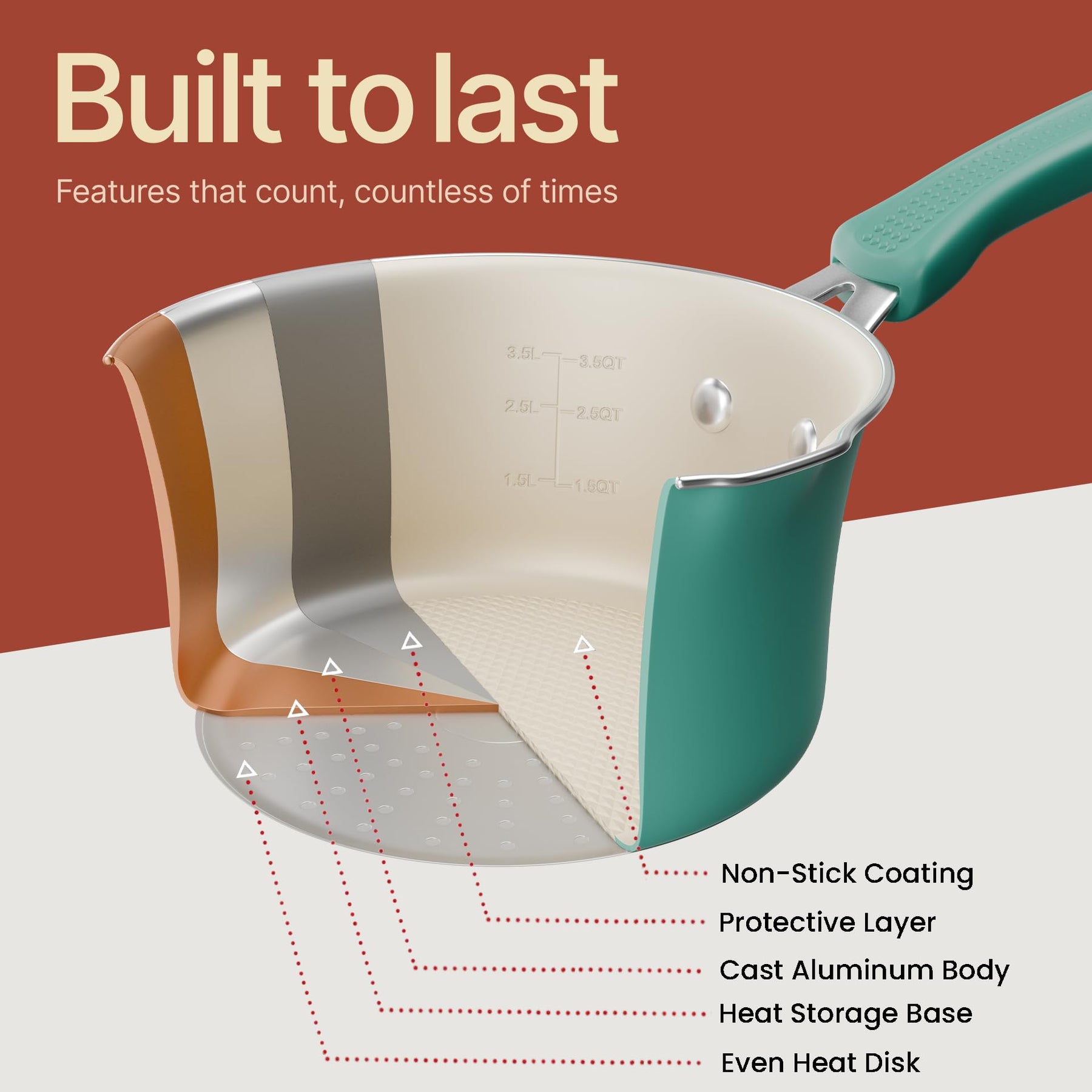 SAFETY AND STYLE : The pots and pans set can withstand temperatures up to 500°F. The cool-touch handles provide a secure grip making it easy to transfer your pots and pans from the stove while the tempered glass lid traps heat while maintaining visibility.
