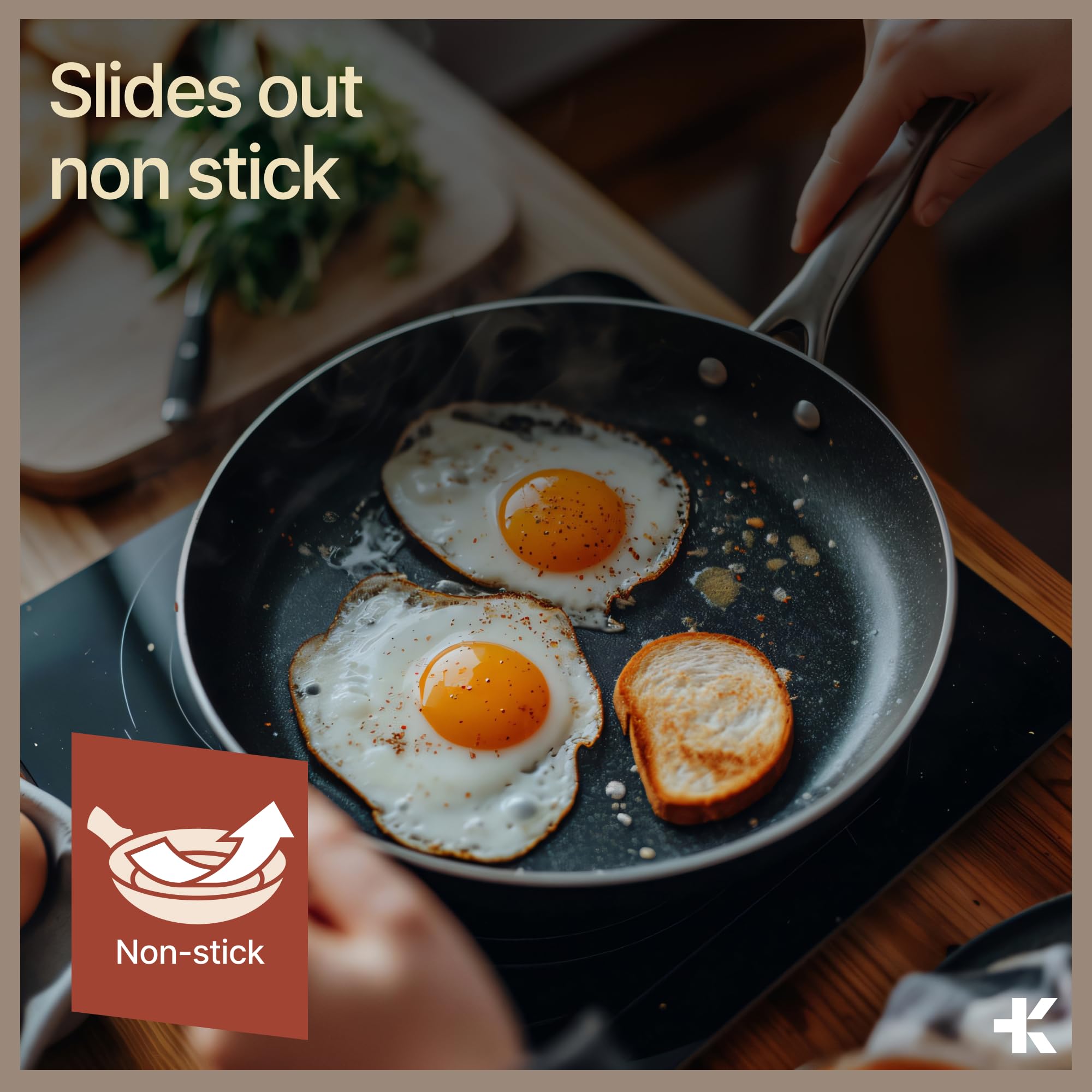 NONSTICK COOKWARE SET – Crafted with PFOS and PFOA-free materials with non stick coating that’s safer for health and 10x more nonstick, ensuring easy food release and cleanup. Though dishwasher safe, handwashing is recommended to maintain its premium quality.